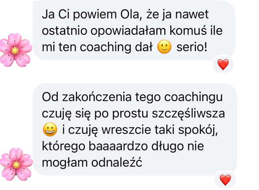 Po całym cyklu spotkań, mogę śmiało powiedzieć, że bardzo polecam wzięcie w nich udziału każdemu kto jest choć trochę zagubiony i chce lepiej zrozumieć co jest dla niego w życiu ważne :) Ola wprowadza przyjazną atmosferę i bardzo trafnie zadaje pytania. Zadania, które proponowała były inspirujące i pomagały poukładać sobie wiele tematów w głowie. Do tego bardzo odpowiadała mi forma spotkań - można uczestniczyć w nich w takiej formie w jakiej się chce. Dzięki temu wszyscy mogli na zajęciach czuć się komfortowo :) Osobiście bardzo mi to pomogło :) Udało mi się lepiej zrozumieć siebie i zmotywować się do działania. A dodatkowo dobrze się bawiłam :)